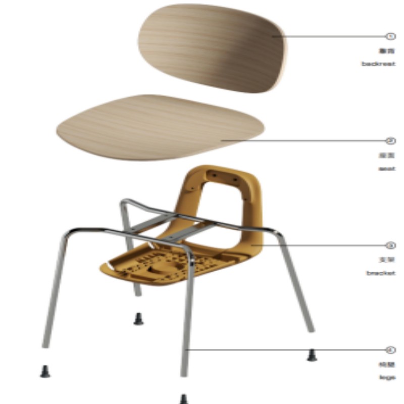 2.坐板:坐板规格为425*435mm(±5mm),坐板选用多层天然木皮横竖叠加,经高温热压一次成型;成型后坐板呈三维曲面,坐板后端仰角不低于R50圆弧支撑腰臀,坐板前端俯角不低于R145圆弧撑托大腿部分,坐板两端接触臀部仰角不低于R400曲面,坐感舒适久坐不累;饰面部分选用优质木皮饰面,纹理美观、打磨圆滑;表面采用环保油漆涂装,硬度高、耐磨性强、漆膜饱满,经三底两面喷涂,漆膜涂层无剥落、露底、针孔、花斑、划痕等。甲醛释放量符合国标GB 18584-2024《家具中有害物质限量》检测标准。