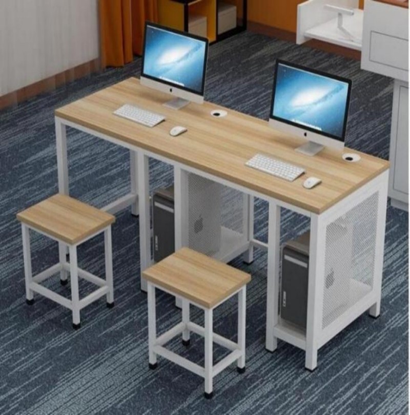 1)钢架木面,面板为≥20mm厚三聚板,颜色为红橡色,环保安全,防火阻燃;桌面开有出线孔,台面板四角倒圆角,阻燃、耐磨、防潮;
